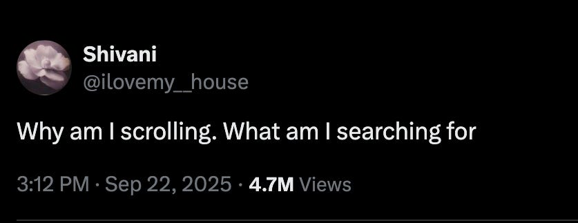 You’re doomscrolling because you’re looking for something to transform you but you can’t stay with one thing for long enough to be transformed by it. You have short attention span on an existential scale. You’re gliding past thousands of small worlds in minutes, laughing at one post, feeling dread at the next, tempted to buy something right after. There’s no plot, no mission, no finale.